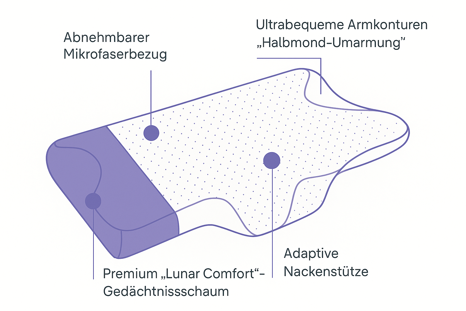 Jedes Detail dieses Kissens wurde mit Blick auf Ihr Wohlbefinden entworfen – für eine perfekte Umarmung Nacht für Nacht und ein erfrischtes Erwachen am Morgen. Spüren Sie den Unterschied mit unserem einzigartigen „Lunar-Comfort“-Schaum, der Ihren Kopf sanft umschließt und dafür sorgt, dass Sie erholt und voller Energie in den Tag starten.